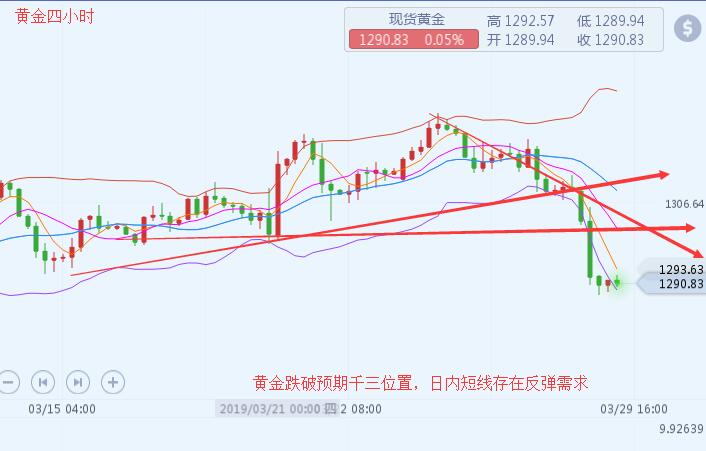 沐舒阳:4.1金价千三受阻高位看空,原油关注61压制 黄金周尾反弹继续承压1300,黄金空头占据有利地位!周尾日内亚盘金价低开横盘1290附近,午盘后金价小幅新低触及1286.8低点支撑后,欧盘开盘后金价止跌亚盘低点企稳1290后形成多头反击,延续美盘前半场反弹触及1299.5靠近1300关口。尾盘金价再度承压1300后终结反弹,下跌1292一线收尾!日线图虽收取小阳不过周线图金价阴包阳的局面出现,预示短期内金价将继续保持偏空弱势形态。 日线上,金价处于中轨位1300下方运行,下轨支撑关注1278。RSI指标破中轴50数值后目前继续保持拐头向下,MA10和MA30日均线粘合后形成开口向下,M