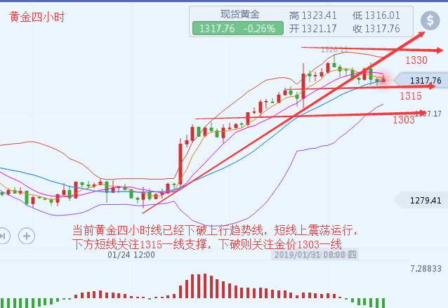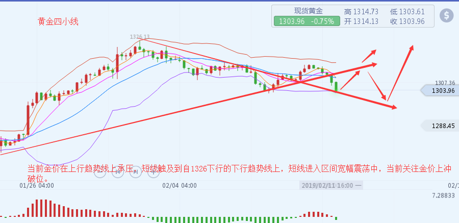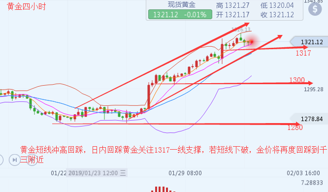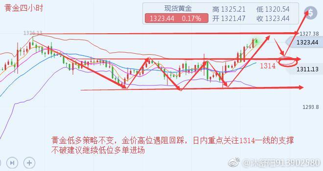 沐舒阳:新年新气象,黄金中线守住1302看涨 新年伊始交易不断,虽然有些忙碌但还是奋斗在第一线,陪伴着亲爱的客户们。新的一年新的开始,感谢2018年一路有你,一起前行,收货永远没有终点,现金为王,感恩所有的朋友,被信任是一种快乐,2019年曾文珂继续与您一路同行,感谢大家的支持是我前进的动力! 上周金价从周一开始直接回落,在跌破1308后出现了加速调整,在周四探底1302.6回升,今日早盘承压1315震荡回落,午后跌破1310加速回落,最低触及1305。短周期晚间美盘下方重点关注1302前期低点得失,黄金本周能否继续破高较为关键,不然将会进入一个高位宽幅震荡阶段,周线来看整体还是多头上升