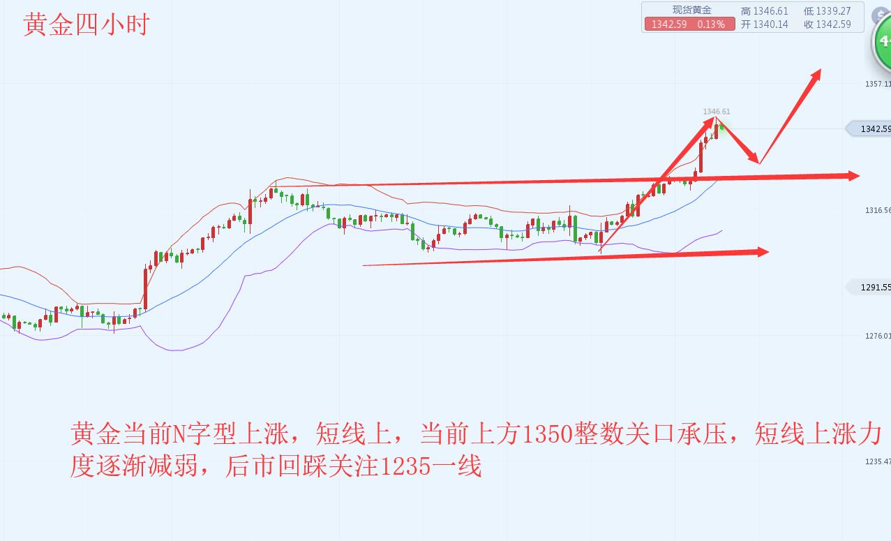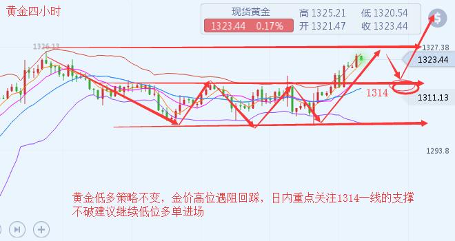 沐舒阳:黄金再创新高后市还会继续涨吗空单被套解套操作 黄金多头晚间爆发了,经常提到的高点低点同步上移属于强势的延续。而日线级别出现小阳线垫底之后,今日要大阳线冲刺了。可能后期短期将有望试探1350-60这个强压区域。这个是对于后市的预期,并非今晚就到。而短期来看,黄金欧盘上涨之后,基本价格未见回踩,连续性反抽,指标上是略微有所背离,而时间是凌晨时间段相对波动会减小,而再强势行情中往往是指标修复价格,就是行情以高位的区间震荡,时间换空间,等待指标靠近价格而进行修复的概率比较大 当前黄金4小时图上震荡反弹;黄金短线涨势较为强劲,金价逼近1333美元水平,MA均线再度恢复涨势且处于看涨排列走势。这
