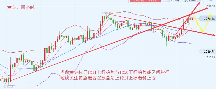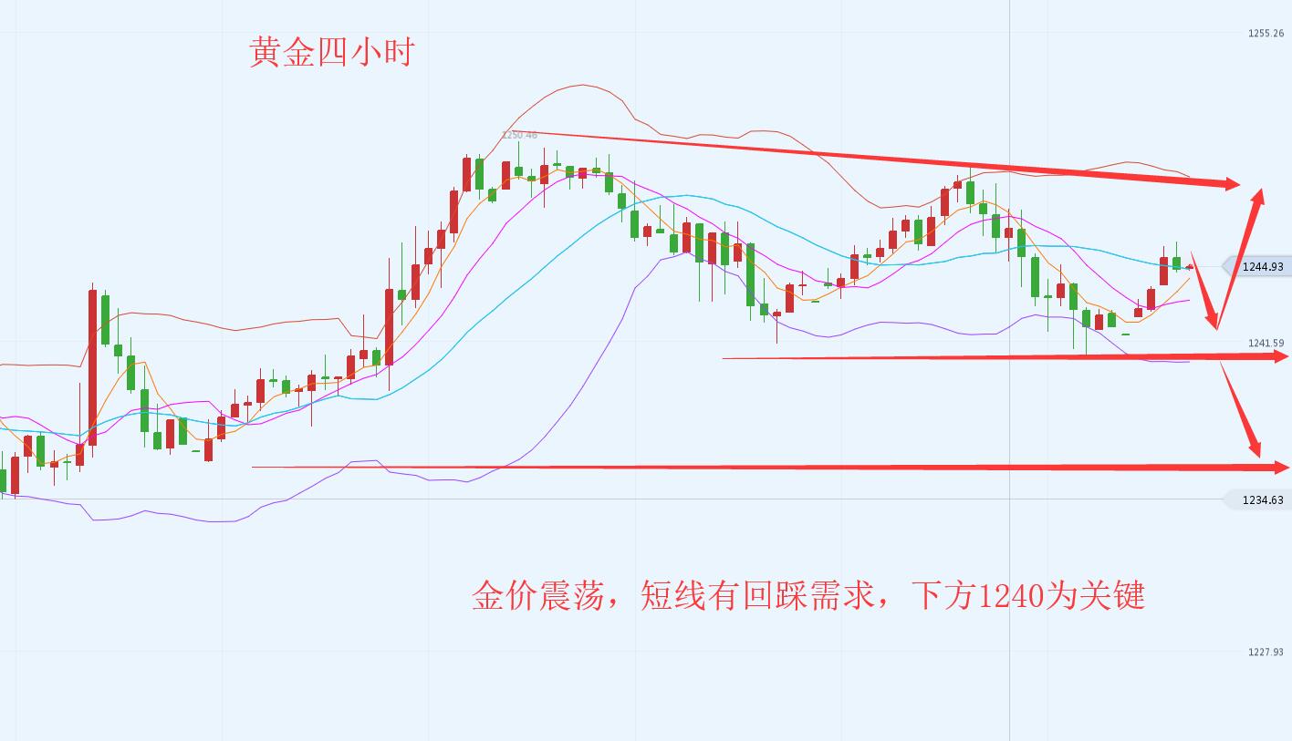 沐舒阳:12.18黄金上方承压1250下方可空 昨日黄金强势高走日线上强势高走,短线上金价再度触及50位置开始回落,终收大阳柱于1245一线,早间金价开盘短线回踩后继续高走.昨日本人在1239一线布局空单,最后也只的在1240小幅止损出局,而后反手多单进场,最终选择在1247一线止盈出局,日内黄金技术回踩上方承压于1250位置,虽然当前黄金上涨动能强势,但是上方以后有阻力,日内操作上还是建议以反弹空为主,上方触及1250附近可以做空,下方触及1240支撑可以多单进场。 黄金,昨日黄金日线收阳,短线上金价上涨得以支撑,整体看来,黄金在日线上黄金多头趋势表现明显,但是考虑到近期美联储的影响,黄金