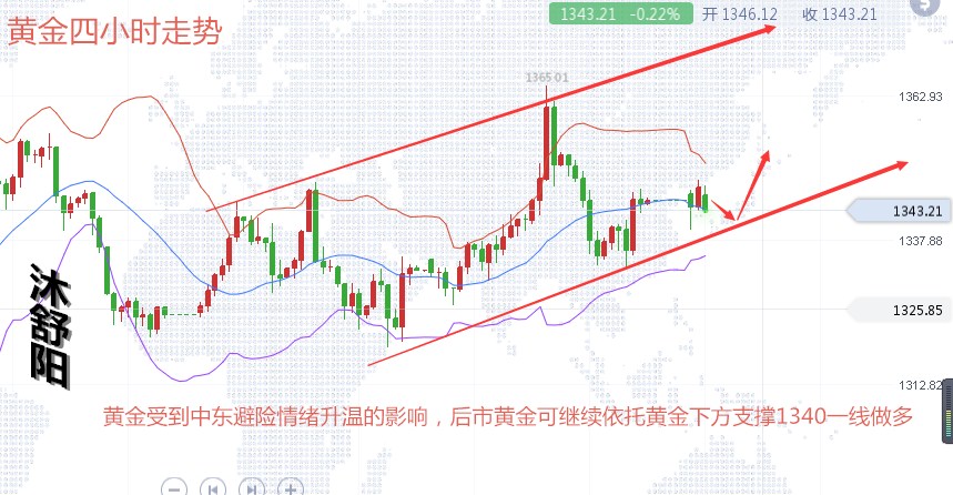 沐舒阳:4.16黄金开盘回落后继续高涨,后市关注继续1350 受到中东战事的影响,黄金开盘之后多头继续上涨,上方短线关注1350,目前黄金在四小时线看来,多头还会延续,由于本年度黄金多次冲击过1366一线并没有出现强势的破位的情况,所以黄金在短线上继续在1366承压,本次黄金受到中东的冲击,继续高涨是没有错的,但是美