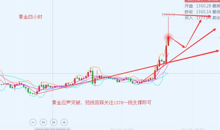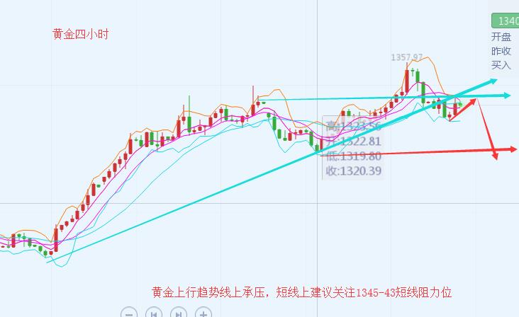 沐舒阳:6.28黄金多头回归,日内千四上方以做多为主 黄金价格周四整体下探回升持稳1400关口上方,当前金价交投于1410美元附近;金价持稳因投资者希望从贸易谈判中获得更多线索;贸易谈判提振了风险偏好,并带动美元,但金价维持在1400美元左右的关键支撑位;当前,黄金市场关注焦点集中在G20峰会。 当前黄金在日线上表现来看,黄金依旧是保持一个多头上行的趋势,而且金价在日线上是企稳在1400一线,后市虽然KDJ高位死叉运行,K线高位类十字星后紧跟阴线,这只是金价在短线上为了规避强势上行所产生的震荡回踩趋势,而且当前金价依旧是守在1400上方,午夜金价在日线上千四支撑依旧是有效的 。 而在四小时走