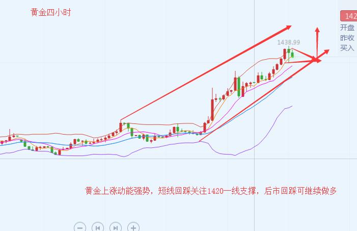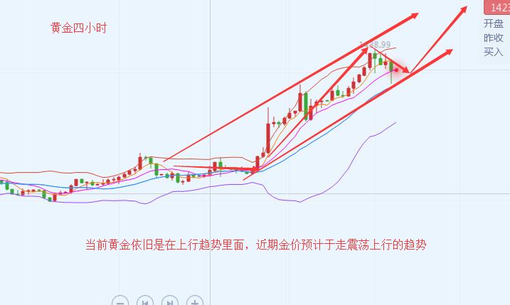 沐舒阳:6.25黄金一涨再涨,短线回踩继续做多完事 黄金今日的多空切换的频率很快,欧盘前快速的回撤1420附近,而继续反抽1435,目前保持1430附近震荡。首先黄金之前的下跌破1425一线小时图最后一次起涨位置也是日内涨幅的0.618位置,但是反抽又过去了1431.5日内下跌的0.618位置。 极强的行情中,一般价格回撤的幅度相对会很小或直接保存高位震荡。而回撤过大之后,价格可能今日一种区间的宽幅震荡,这里提到的区间震荡是需要修复的过程不是说整体行情就完全走弱,日内欧盘的开跌口1436附近,而起涨点是1422附近。 日线上看来MACD金叉运行,布林带趋势典型呈开口向上走势,这属于典型的多头