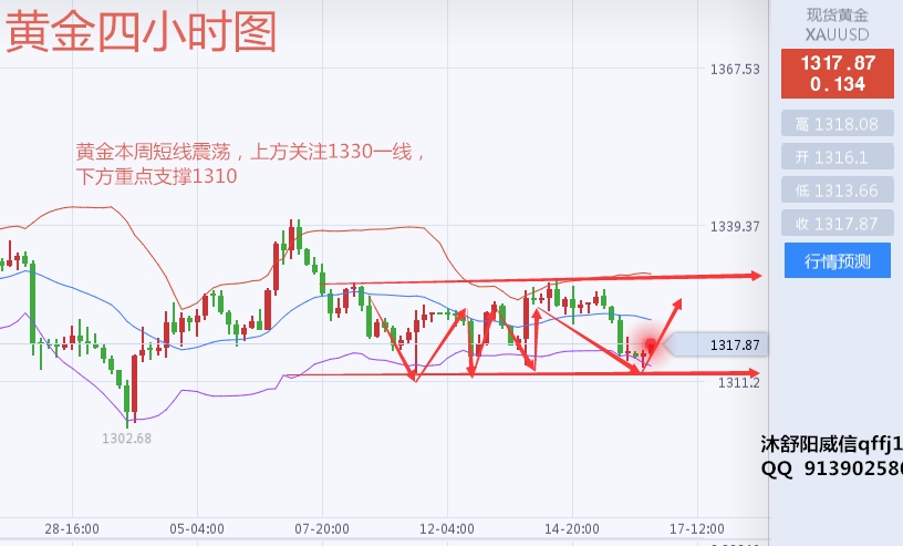 ~沐舒阳:黄金震荡看空 晚间继续关注1310支撑,多单解套 针对于美联储利率决议与加息,黄金波动必然是剧烈的,对于大行情,谈股一直是保持着警惕的态度。回顾之前很多次的加息,基本上,大体行情走势都是提前消耗加息预期,等待美联储利率决议之后,加息决策落地,黄金筑底反弹,一波走回V型反转甚至突破。 技术面: 黄金4小