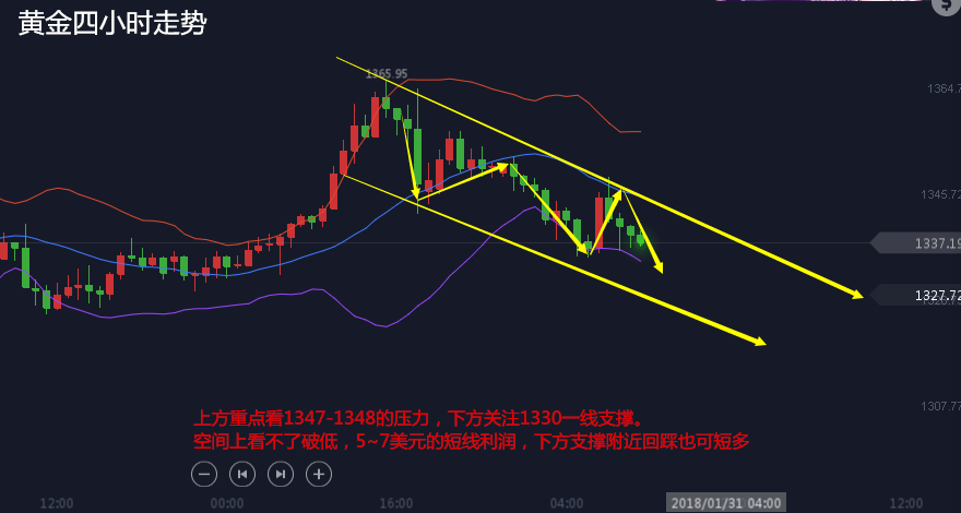 沐舒阳:1.31黄金日线转空,下方关注1330一线 微信/QQ 913902580 美国COMEX 3月黄金期货电子盘价格周二(1月30日)收盘下跌3.3美元,跌幅0.25%,报1336.10美元/盎司。周二金价继续下跌,因投资者继续押注强劲的经济增长,同时通胀环境改善可能会促使美联储采取更快的货币紧缩政策。 黄金 昨日黄金走势可以说是一波三折。早