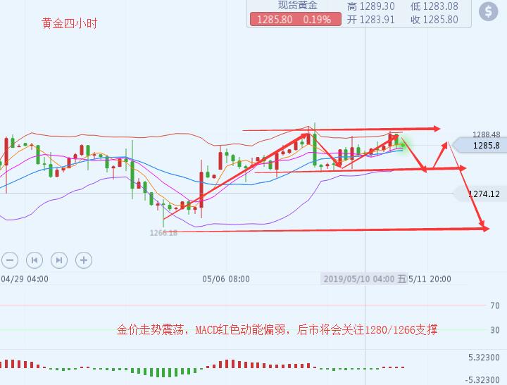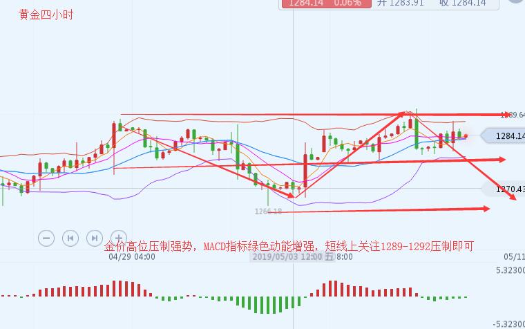 沐舒阳:5.10黄金震荡周线收官,日内能否破位 昨日金价开盘于1280一线,后市初请数据公布,金价受到机构拉盘的短线走高,上方触及1290压制位,午夜金价回踩,终收盘于1283位置,日内周线收官,按照往常走势来看日内金价在短线将有所突破,后市中线多头依旧纯在压制,这两日黄金也是在90-80区间波动,金价一直处于一个区间震荡的走势,中长线来看,金价自1246.6位置下行以来,金价在第3浪下行结构中已经到达1266低点,黄金处于下行第四浪反弹结构中,后市空头空间还是有很大,而且金价第四浪反弹结构金价高位已经到达了1291位置,短线反弹近30美金的利润,昨日金价高位到达1288一线,在1290位置