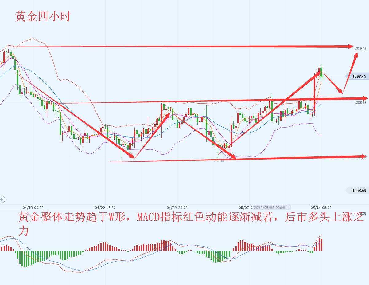 沐舒阳:5.14黄金再创近期新高,后市是否会延续多头 昨晚中美贸.易战升级,黄金在短线上强势破位新高,日内早间时段,金价多头延续,金价在度上涨到了1303位置,空头趋势强势受到压制,后市金价高位回踩,当前金价最新报价位于1298一线,而昨日我们选择在1282一线做多,后市多头也是完美获利,当前金价回踩,中线金价依然是打破了之前区间上的波动,金价后市多头即将会发了,继续上行,而面对中国增加对美的关税这块,美国后市也会将进行回应,这样看来,后市美方若进行积极应对,届时美元必定会得到提振,从而对黄金进行有力的打压,所以这样看来,金价虽然突破1300分水岭,但在后市操作上,黄金依然是不可贸然的做多。