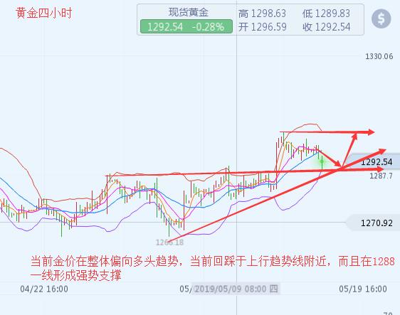 沐舒阳:5.16黄金短线受挫,近期黄金继续震荡操作 白盘时段,黄金短线上多头受到压制,到了下午欧盘的时候金价短线受挫,美盘开盘后黄金空头延续,早间在1298一线布局的空依然是获利出局的,而当前金价回踩至1290附近,下方依然是存在MA20均线支撑1288、1286一线,中线上着是重点关注该支撑位置能否会下破,日内金下多头遇阻下探,中线上看来是有下探的可能性,但是考虑近期中美避险情绪的影响,金价则是有望守住支撑继续向上突破的,所以这样看来,中线上仍然是可以在支撑位附近去博取一个多头的利润的。 当前在日线上来看,金价自周一金价受到避险情绪的影响短线上行到1303附近之后,近期黄金一直处于一个震荡