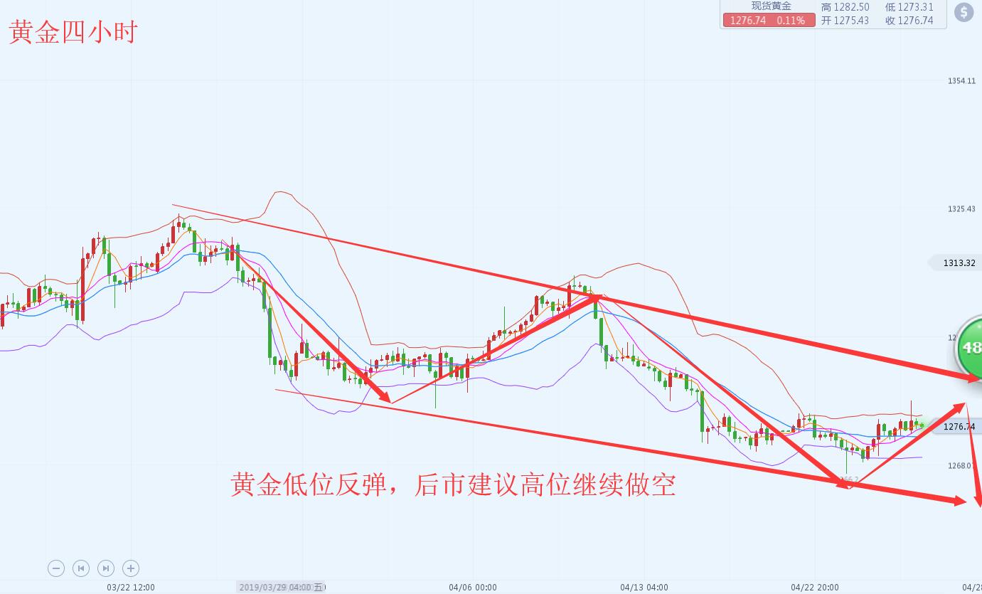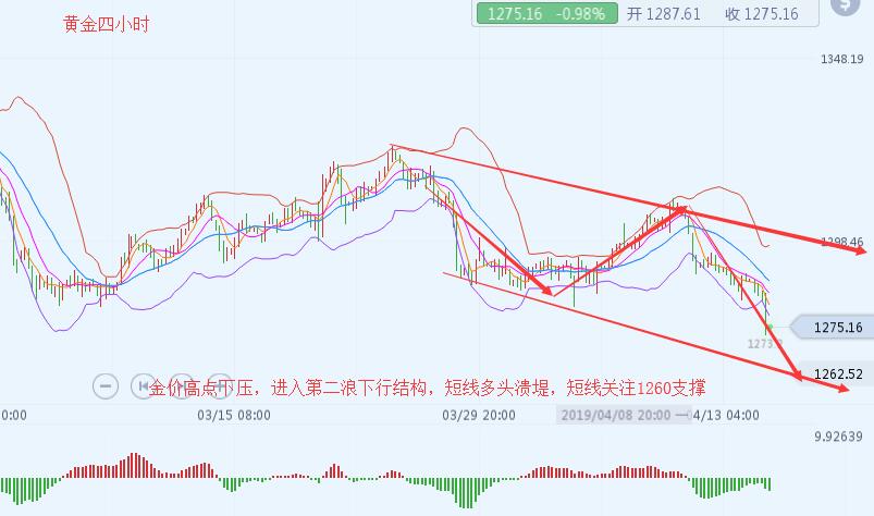 沐舒阳:4.17金价下行陷入震荡晚间继续偏空 周初金价为何短线跌空 4月份黄金ETF基金持仓数据示,市场持续抛售黄金,昨日全球最大黄金ETF持仓再度减少3.82吨,总持仓量降至754.03吨,创去年11月9日以来最低水平。除此之外,全球风险情绪的升温,打压避险黄金的需求,尽管美元也承压。加之制造业放缓是由于去年1.5万亿美元的减税刺激了资本支出,但如今刺激效果已经消失,打压黄金。 黄金短线四小时看来 ,金价当前已经突破1280下行支撑点位,后市多头已经完全溃堤,短线上金价下方的缺口依然是已经被打开了,下方后市支撑看来1260位置,当前金价在四小时的表现来看,进件依然空头已经占据上方风,当前已