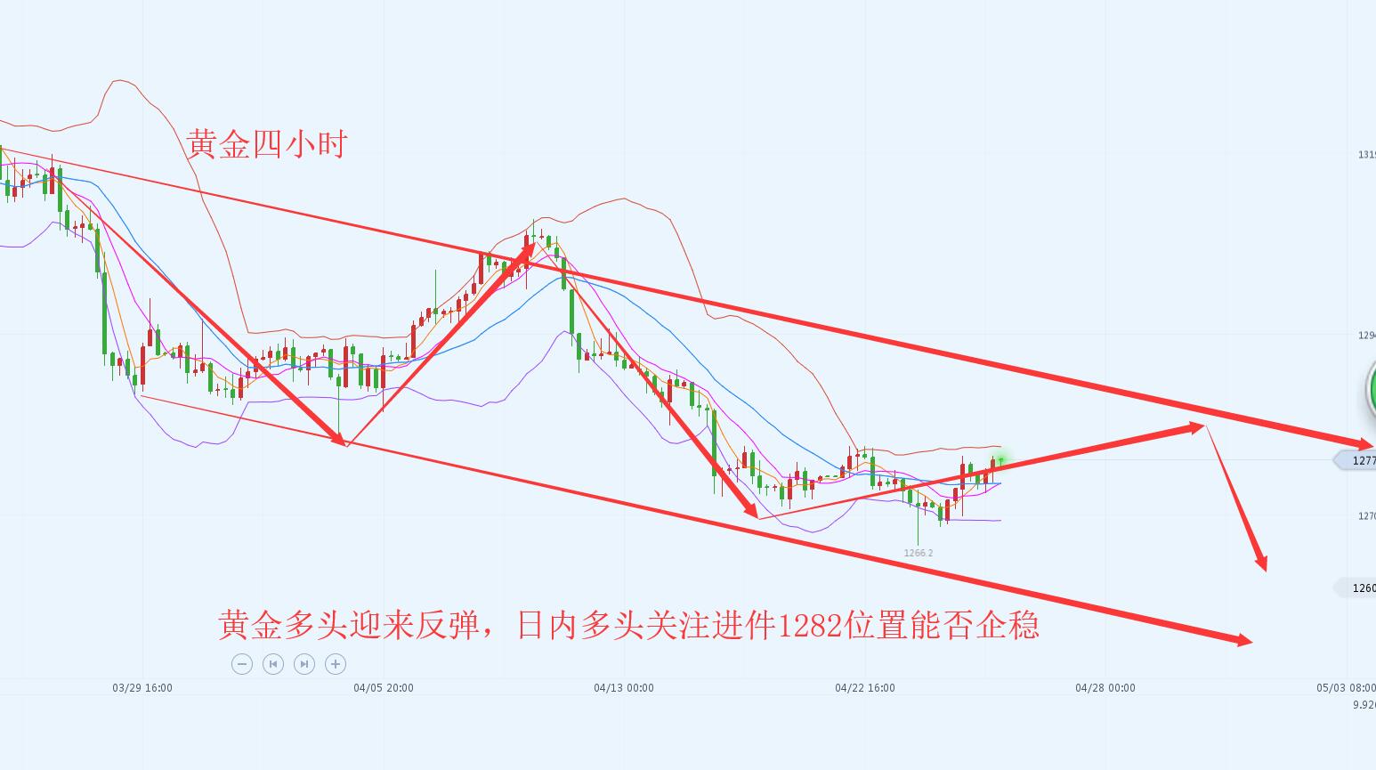 沐舒阳:4.26黄金反弹无用,后市还得看空 国际金价小幅走高,一些国家经济数据意外恶化,重新点燃全球成长放缓的疑虑,导致股市下跌。但强势美元牵制金价上行势头,美指再度刷新近两年高点。美国之外的全球经济增长数据实际上表现十分糟糕。德国4月商业景气指数下滑,韩国第一季经济意外萎缩。 从周线上看,黄金本周最高上涨1282一线,也就是今天突破的高点。最低下跌1266一线,是4月23日周二破位的低点,而1270只是小破,并没有完全释放能量,周线目前的小黄线虽然下压,但暂时受ma30和ma60的交叉支撑,但有小刺破,所以如果黄金再次破位新低,这个支撑其实已经不管用了,要说管用就得看周线的下轨支撑线了。周