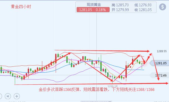 沐舒阳:5.7黄金震荡高位继续空,日内金价关注1288压制 昨日金价冲高回落刷新日低至1278.40美元/盎司,日内转跌0.04%。美国拟对中国加征关税,而有消息称中国在此威胁下考虑取消两国贸易谈判。在全球贸易环境再度出现波折的背景下,避险资金重新回流美国固定收益资产市场,导致非美风险货币在周一跳空低开,美元指数上涨,黄金由涨转跌。后市关注美股表现,若其普遍下滑将再次支撑金价。对于黄金日内的一个短线交易而言,由于短线的黄金价格先上,那么这里建议可以先去尝试短空。 4小时方面,黄金目前已经反抽到了一个前期的开跌口压制位1285-1286美元/盎司附近,而日线周线级别的高点下行趋势线压制位处于1