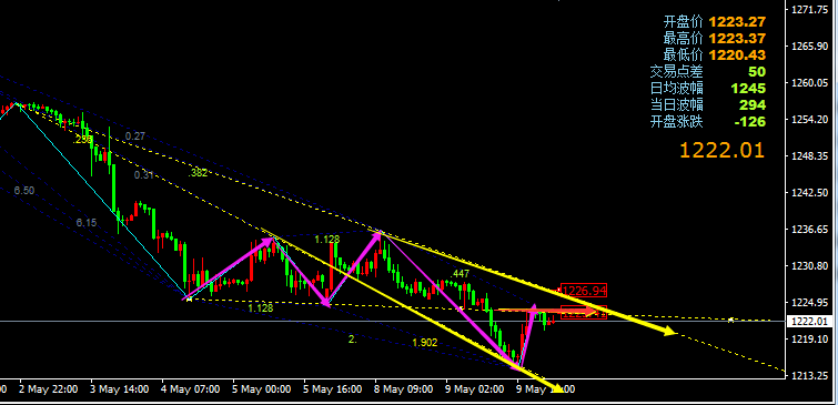 周日亲欧盟马克龙赢得法国总统选举后,避险需求下降, 黄金 开盘一度跌至1221.05美元/盎司的新低,随即触底反弹,美式盘中最高上探至1236.39一线,周一公布的美国4月就业市场状况指数录得3.5,远高于预期,美元受到提振上涨, 金价 受到压制,总体而言价格波幅也没有太大的意外,早间开盘价格冲高我们就给出过1236一线的空
