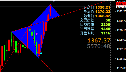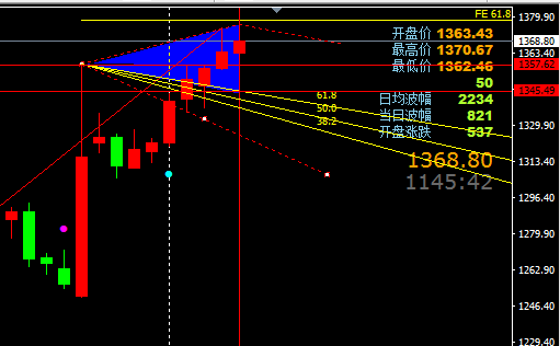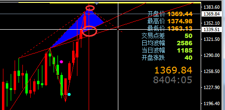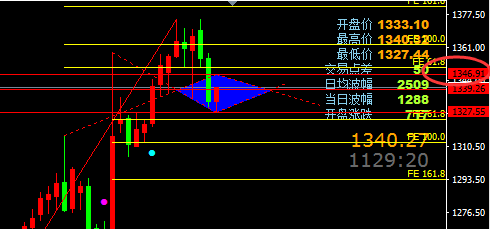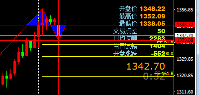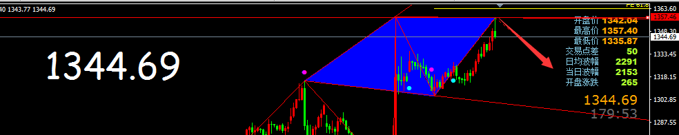 昨日行情就想天气一样,阴晴不定。白天还是好好的,一觉醒来水漫全城。昨日开盘1348一线,开盘价格上涨至1352一线回落至1338一线反弹,之后维持在1350下方震荡。晚间二次破高1353一线未果。价格陷入震荡之后价格出现一波快速下跌至1342一线反弹三次破新高至1358附近。最终收盘于1356一线,日线以光头带有下影线的阳柱收尾。