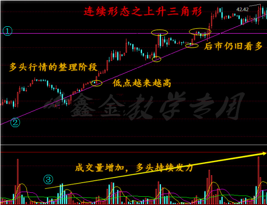 今天由于圣诞节延续停盘,时间比较充裕,早上将一位客户的风控方案制定好了之后就简单备份课件,临时给大家讲解一个比较复杂的K线形态--连续形态之上升三角形,后期的会不间断更新,今天只是一个小插曲。 「鑫金:上升三角形概念描述」 三角形是股市图表中(现用于现货中)比较常见的一种形态,在实际走势中常出现于各个