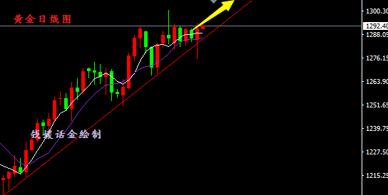黄金从技术面分析,日线上周五收长上影阴线,前期的双顶位1296一线强势破位,整体上升趋势线内运行,均线系统向上发散运行,已全部破位,价格承压5日均线,BOLL开口向上运行,价格处在上轨下方位置,整体来看目前的多头趋势有所减缓,虽在继续破新高,但在触及趋势线顶部后,行情回调力度是比较大的,日线总体趋势依然看涨