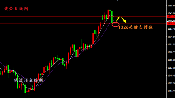 周末朝鲜没有如市场预期般的发射导弹,黄金昨日早间跳空低开,避险情绪降温黄金也并没有回补缺口,只是小幅修正反弹,昨晚美指美股更是大幅反弹,毫不犹豫的再次打压黄金,目前黄金再回1326,钱媛认为,现在还不能判定黄金已进入空头,下方关键支撑1314,只要守住了此位,黄金依旧处于上涨趋势,早间给出的关键支撑1326已破