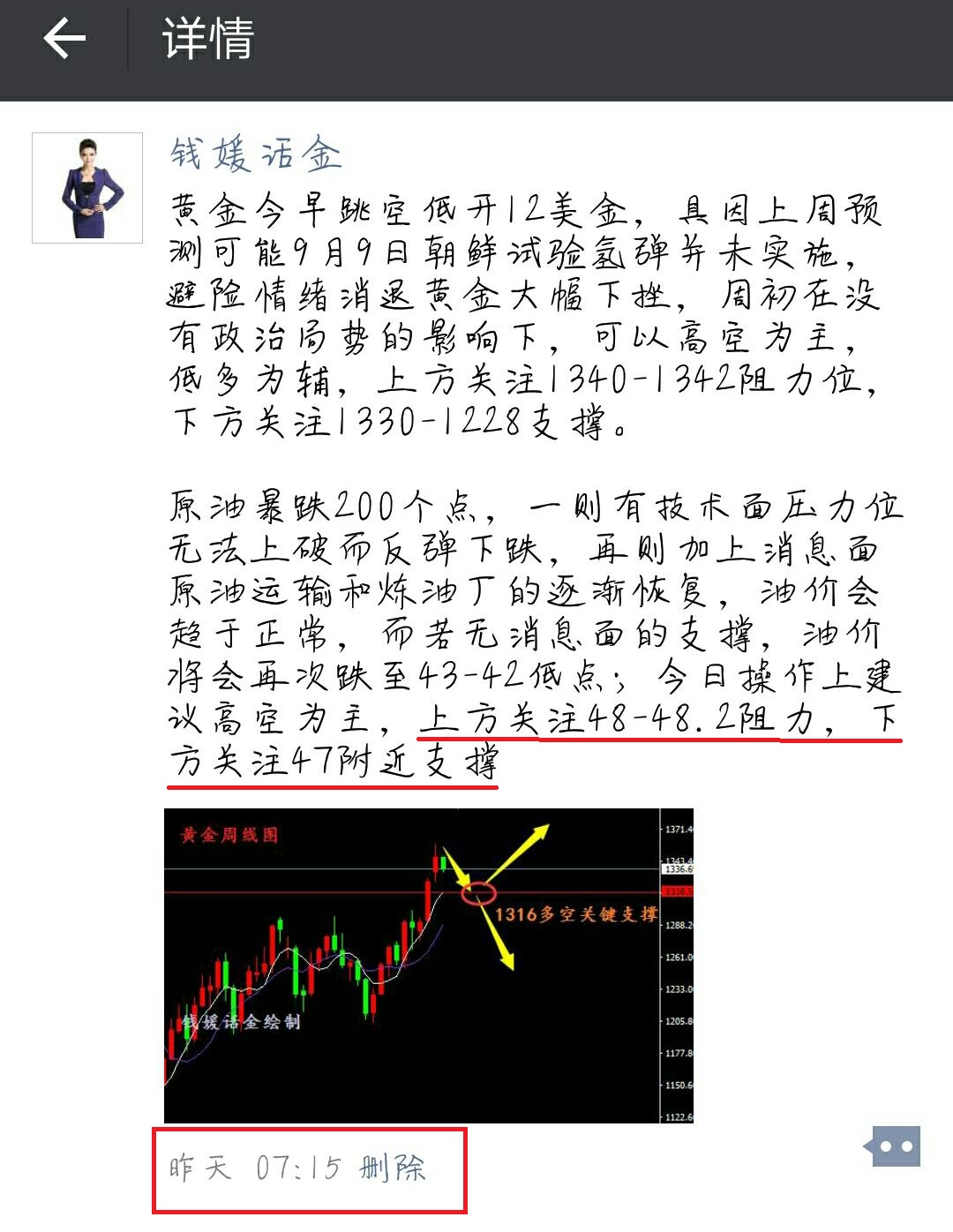 金九银十到来,近期行情绝对够大,那么中线布局机会来了:若朝鲜继续来些大动作,黄金继续上行,上方可以直接看到去年高点1373位置,这就有40美金空间;若金三胖继续停火不搞事、美联储明确表示年底加息,黄金必将大幅跳水剑指1200大关,这将是140美金的空间,按十手算,也就是91万RMB!抓住了利润翻几倍仓都没问题,机会在
