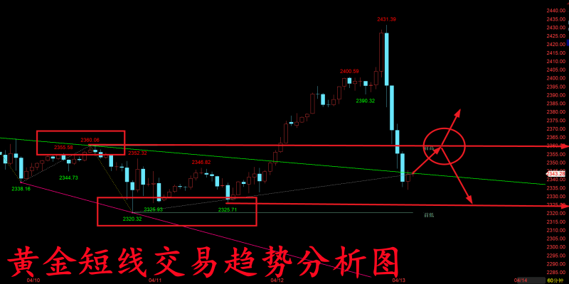 结合昨天黄金技术面来看,日线级别在昨日出现近期罕见的大阴柱,说明金价的强势上涨暂时得到了修整,但目前只能说行情暂时没有那么强势,但并不代表行情方向发生了变化,市场的利多风险依然存在!另外消息人士:美国和以色列情报评估,以色列即将遭到来自伊朗或其“代理人”的大规模袭击,中东地区局势依旧不明朗,一旦有新的冲突势必进一步提振金价。一旦再次突破2355,金价这一轮回调宣告结束,新高随时到来;但如若本周没有什么较大消息面影响,行情收线在了2330关口下方,那么金价可能会进行一轮新的回调,下方则有望冲击2300一线关口。 昨日白天黄金走出冲高回落,上方最高触及2359一线开启震荡走低,并且在晚间CPI数