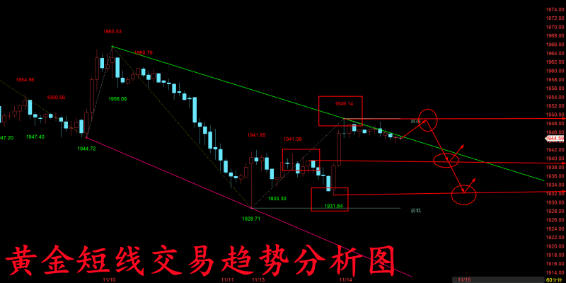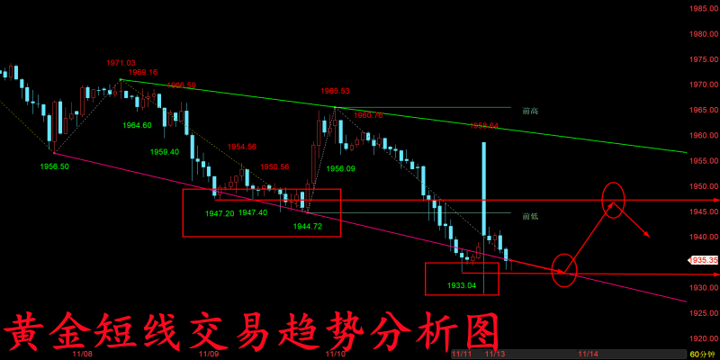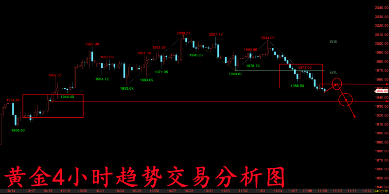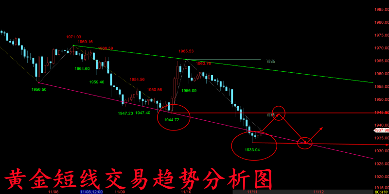黄金周五行情也是再度从上方1960高点跌回了周四下方的最低点1945关口,并且随着美盘开盘,周五黑天鹅单边下跌的影响,行情更是一度跌破1945去到了下方1942低点,虽然随后十一点的数据有利多影响,而这波数据影响也只是给到了我们一个反弹再度空单的机会,随后行情便再度从上方1945附近开始逐步走跌,最低也是再度触及了下方1932关口才有所企稳! 那么随着周五这波持续走跌的行情来看,上方再度做空的点位就来到了周五美盘那波反弹的区间高点1942-1945关口附近,而下方的支撑则已经去到了1932-1928关口,但整体趋势依旧是一个延续走跌的行情,那么我们前期最终空头看到下方1900关口的目标仍然不