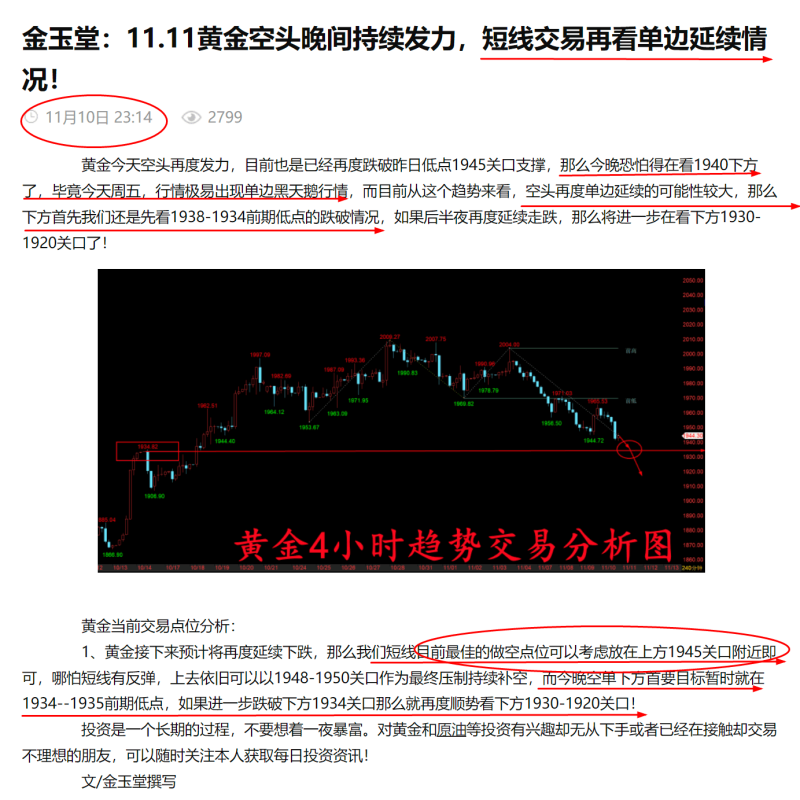 你今天的努力,是幸运的伏笔,当下的付出,是明日的花开。即使现在还看不到成果,请不要着急,最好的总会在最不经意的时候出现,怀揣希望去努力,静待美好的出现。 黄金周五再度从上方1960高点跌回了周四的的最低点1945关口,并且随着美盘开盘,周五黑天鹅单边下跌的影响,行情更是一度跌破1945去到了下方1942低点,虽然随后十一点的数据有利多影响,但是也只是给到了我们一个反弹补仓空单的机会,而这个时候我们团队的实盘客户也是基本都在上方1945附近进场了空单,随之凌晨二点半在下方1934附近全部获利出局,虽然没有将空单利润全部把握,不过我们美盘开盘后再度做空的点位把握的还不错,也恭喜周五后半夜还在坚持