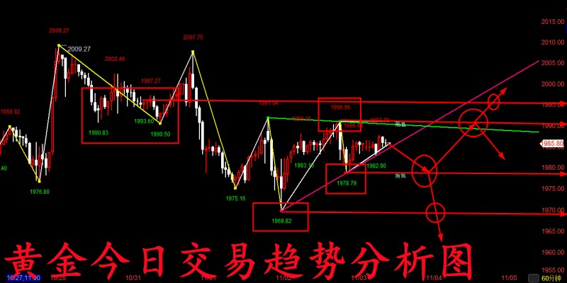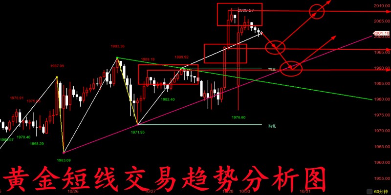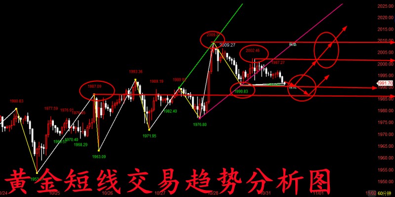 从上周连续几天的来回波动来看,无疑不透露着短线只要行情有洗盘走跌的迹象就是我们进一步补仓做多的好机会,而在当前巴以冲突和美国来回的搅局下,黄金本周恐怕也仍然会走出这种来回洗盘的行情! 并且经过上周五这一波反弹走高后,接下来黄金恐怕将开始持续在2000关口上方徘徊延续走高了,而我们目前下方短线做多的首要支撑也是已经上来到了上方1996-2000关口,而当前来看,如果今晚行情再度有大幅度回调的需求,甚至一度跌破1996关口去到下方1988-1990关口,只要当前巴以冲突仍然在,哪怕回调到更低点我们短线也还是以做多为主! 今日黄金短线交易思路分析: 1、黄金市场短线首要做多的点位可以暂时放在周五的