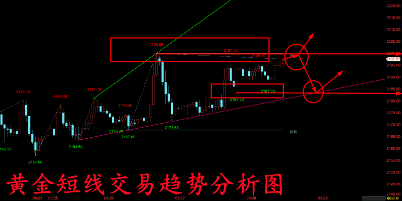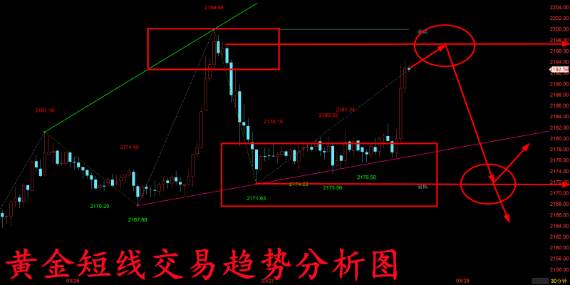 市场往往不可全部预测,但又可做局部预测,所以,在变化的行情中,需要不断的调整,才能更好的迎合市场。就像昨天行情一样,即使周二看好震荡慢跌,但在欧盘被多头资金砸盘影响,黄金出现意外的暴涨空间,最高一波一度上涨至2199附近。 不过这波上涨的确在当前趋势之内,因为,前期强调的2145趋势重要支撑点没有延续破位,那么行情在趋势之下随时上涨也合情合理,但在大行情之后,要冷静的分析这波黄金上涨的原因--这波上涨的特点是,时间短,大空间,确认是市场机构买盘资金的介入,那么,就可以肯定上涨的连续性不强,所以昨天晚间我们短线便考虑在上涨高点2198-2200附近压制开始做空了,具体大家有时间可以参考本人**