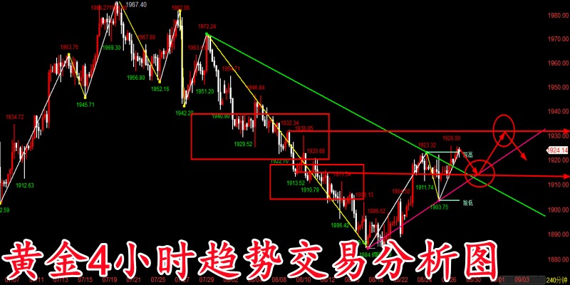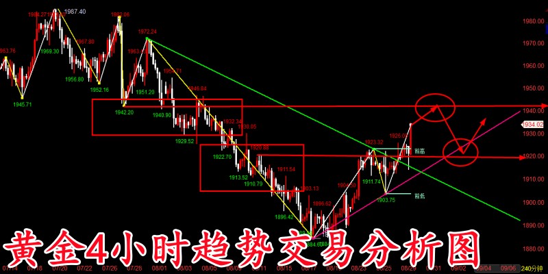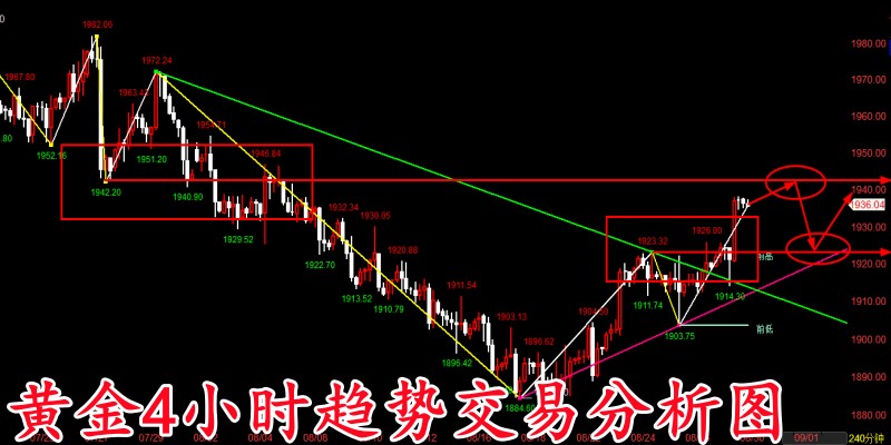 黄金今晚终究是强势的给多头提振了一下士气,行情从美盘前最低试探了1914低点附近后便开始持续震荡反弹,直到十点更是直接突破1926昨日新高来到了短线新高1935关口上方,而今晚我们看多的目标已经达到,所以后半夜短线就不考虑追多了,等待后半夜行情持续震荡修复后,明天白天再考虑布局短线空单看回调后在做多! 目前从技术面来看,经过这一波反弹,无疑是彻底确认了多头的强势,而上周五确定的短线强势压制1926关口也是再度刷新了,而接下来操作上无疑仍然还是看多为主,从日线图和4小时趋势来看,黄金上方进一步的压制已经来到了前期单边下跌底部转换支撑1938-1942关口附近,而下方支撑也已经由下方1903-1