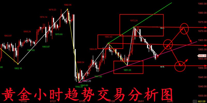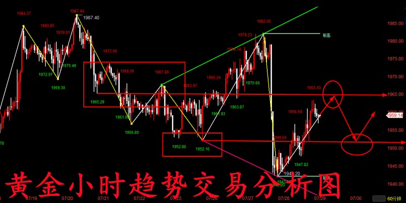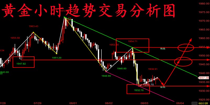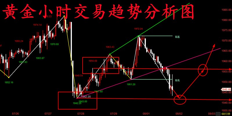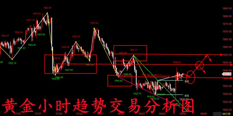 近期公布的美国经济偏向强劲,美联储年内仍可能还有一次加息,美元仍比较强势,目前持坚于近三周高位附近,美元指数触底之后持续反弹,黄金的多头反弹趋势仍然得到了抑制。而且本周即将公布7月非农数据,市场目前对数据的预期也比较乐观,所以短线黄金价格或将承压,但仍在一定区间保持持续的震荡来回走势! 当前黄金小时图上来看,黄金仍然属于震荡走势,但依旧是偏空的震荡!震荡过程中涨跌都习惯性的单边,而内部没有调整结构,所以一旦错过合适的点位只能拍大腿!更不要追涨杀跌,否则只会来回打脸! 虽然现在黄金属于震荡中的下跌波段,但下方的低点支撑1938-1942仍然强势难以持续跌破,而这也是前期持续试探难破的低点位置,