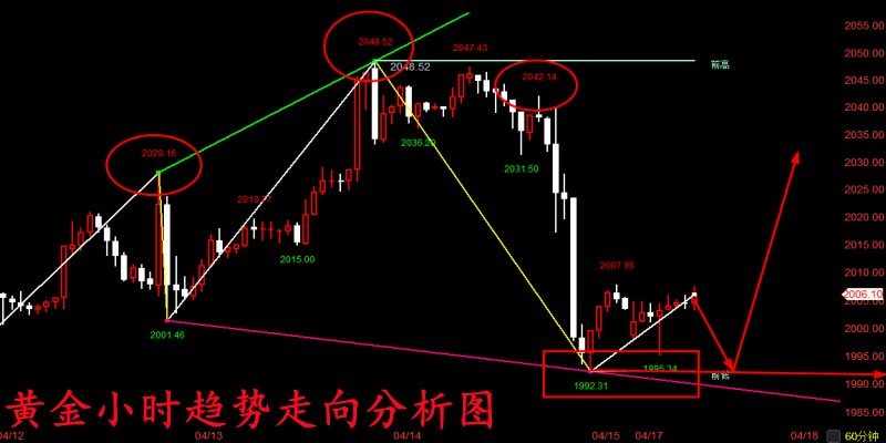 做投资,亏损不可怕,市场上的二八定律是绝对存在的,可怕的是毫无意义的亏损;套单也不可怕,可怕的是没有跟对老师而越套越深;市场不可怕,可怕的是不会分析市场、跟随趋势而盲目做单的投资者们。赚不到钱是有原因的,如果你现在亏损的很严重,很迷茫,感觉看不到希望了,请及时作出调整,没有不盈利的投资,只有不盈利的操作,跟对一个老师,受益一生。 黄金技术面分析: 黄金大趋势分析来看,2000关口的位置成了黄金目前的多空关键决战点位,多空在这个反反复复震荡博弈,但小震荡和小反弹也并不会改变大周期还是暂时看多的趋势,但看多不追多,下周的黄金思路需要等待见底的机会在考虑布局多单。重点目前关注两个位置的强支撑,一个