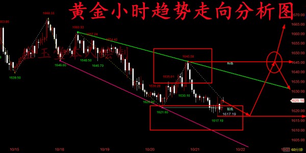 投资市场并不会简单的朝着预期的方向进行,通往成功的路都是曲折的,而一旦走反,则将会失去方向,进入了循环,行情也同样如此,趋势是一定的,但是绝对不会简单地朝着预定方向一直走,期间会出来曲折而动摇人的内心,这时候就需要好的心态来面对! 黄金今天再度刷新近期低点最低来到了下方1617附近,而目前这个最低位,相比于上个月底最低点1614还是比较接近的。那么就目前这个点位,这个极弱的行情来说,现在已经到达了一个关键的时期,而今晚又是本周最后一个交易日,甚至可能出现黑天鹅单边行情的周五,所以我们不得不谨慎交易,其实继续走跌倒是不怕,毕竟下方的空间已经不大,就怕突然头也不回的走出深V反转,并且还不知道今晚