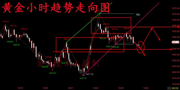 投资市场并不会简单的朝着预期的方向进行,通往成功的路都是曲折的,而一旦走反,则将会失去方向,进入了循环,行情也同样如此,趋势是一定的,但是绝对不会简单地朝着预定方向一直走,期间会出来曲折而动摇人的内心,这时候就需要好的心态来面对! 黄金这两天又回到了前期1640-1660区间来回震荡修复中,可谓是和前几天的行情如出一辙,一旦大涨一波必定会陷入短期呢震荡,那么这次大涨后的下跌,到底是和前期一样再度横盘后下跌呢?还是持续筑底再度反弹继续走高呢? 我们从技术面来看,黄金在小时线在昨日开盘延续探顶1670高点后便开始走向了下跌的趋势,而目前基本全线技术指标都看空,所以我们短线还是需要谨防持续横盘后大
