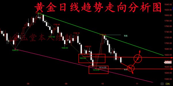 投资市场并不会简单的朝着预期的方向进行,通往成功的路都是曲折的,而一旦走反,则将会失去方向,进入了循环,行情也同样如此,趋势是一定的,但是绝对不会简单地朝着预定方向一直走,期间会出来曲折而动摇人的内心,这时候就需要好的心态来面对! 黄金终究还是延续了空头来到了下方1621低点附近,随后整个白天也基本是走了一个短线反弹修复的行情。随着本周最后交易日的到来,并且当下行情也是已经连续几次试探新低随后再度反弹,而且当前的趋势也已经是相当弱势,那么物极必反,黄金最后几天恐怕会走出一个较大的单边行情,至于能否会彻底触底反弹,还得看市场机构什么时候出手了! 技术面来分析,随着周三持续单边下跌,然后今天开盘