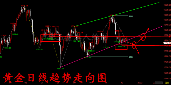 投资不是一朝一夕的事,前期的亏损,不代表后期的亏损:前期的获利,不代表后期的获利。所以,亏损的朋友不要气馁,获利的朋友不要自满,让自己以平和的心态理性的投资。在这个千变万化的市场中,行情的涨跌不是靠个人主观意志所决定的,而是充斥着多于空的搏杀,胜利与失败则时刻伴随左右,但有一点,行情的趋势将会决定未来走向,定势,选位,控仓,成功三部曲,所以,选择远远大于努力,择良师,将会获益匪浅,而我,一直都在。下面本人简单给大家分析今天周二黄金如何布局: 黄金昨天周一整体的趋势向我们完全展现出了一个延续周五下跌的方向,并且收盘之前也是再度刷新新低1787关口,而昨天我们晚上给出的看空思路也是完全符合,那么