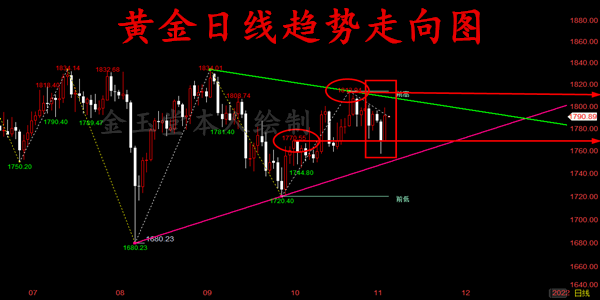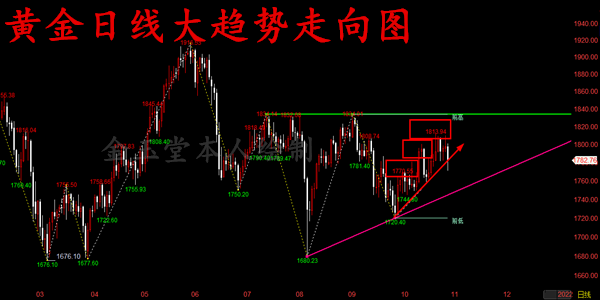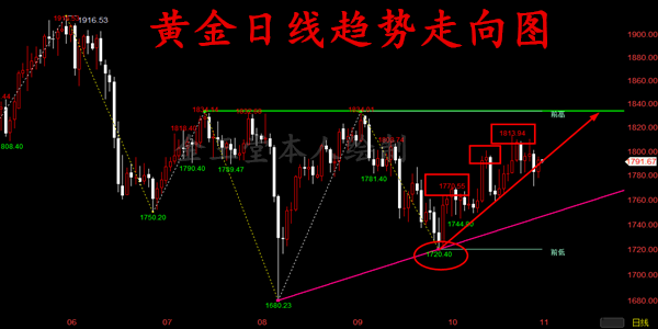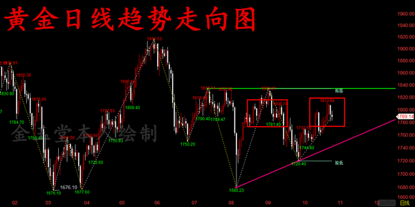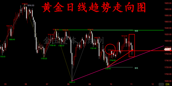 成功的交易者就是“看不准能忍,看得准就狠”的那个完美把控涨跌平衡,短期失败后,还能对后续信号充满信心,并果断执行从不错过的交易者。市场没有绝对,涨跌没有定势,所以,对市场行情的涨跌平衡判断就是你的制胜法宝。欲望!有句意大利谚语:让金钱成为我们忠心耿耿的仆人,否则,它就会成为一个专横跋扈的主人。空头,多头都能赚钱,唯有贪心不能赚。是你掌控欲望还是欲望掌控你?古人云:不积硅步无以至千里,不积小流无以成江海。希望这句话成为我们之间的共勉。 黄金昨天周四行情终究还是再度站稳多头,并且最高也是触及了上方1798关口,昨天我们说过,黄金下方支撑非常多,并且凌晨利率决议的数据影响并不大,如果黄金周四日线收