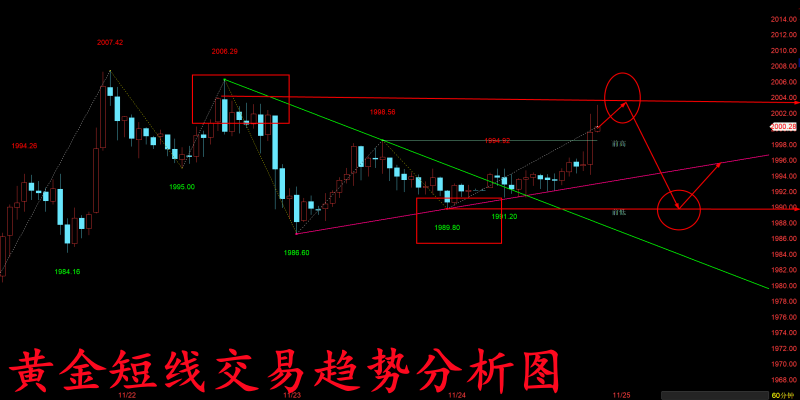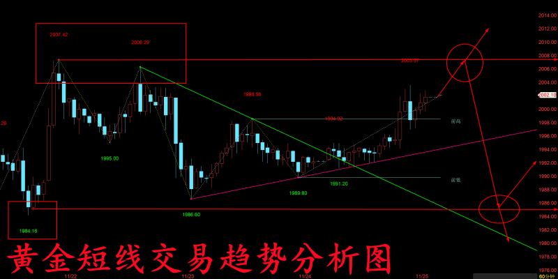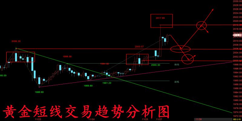 不要总以为行情辜负了你什么,在这个市场,没有谁活得比谁容易,交易简单就迷人:往往许多行情都如此,当你刻意追逐它时,它就会跑得飞快,当你摒弃表面的凡尘杂念,为了策略,为了计划,专心致力与每一波行情时,有些利润反而能轻易地得到。 黄金从走势上看,上周因为美国感恩节休市,整体波幅有限,而行情也是多次冲击2003-2005承压回落,直到周五晚间都还在持续测试上方压力位,随着今日早间市场从感恩节中归来,黄金便直接高开到2008附近后才有所回落修正,但到2000关口再次确认下方低点支撑后便二次破位拉高,目前最高也是去到了上方2018附近,短期来看,周初直接强势破位,行情也是再度转强,那么接下来的操作上重