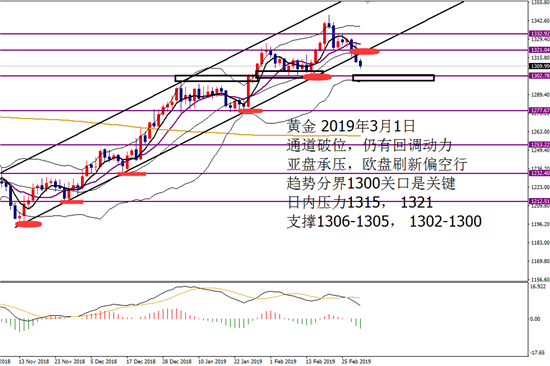 黄金周一亚欧盘横盘震荡,美盘触及支撑反弹,触及压力回落。(震荡行情)周二亚盘承压回落,欧盘回踩支撑,美盘确定支撑反弹。(震荡行情)周三亚欧盘横盘调整,美盘横盘后承压下探。(收窄破位行情)周四开盘承压1321快速回踩1317位置,亚盘持续低位横盘,欧盘反弹破1321后直接走高,美盘前后继续延续测试压力1327,美盘过后承压直接走跌,破日内低点1317,加速下探至1312,尾盘在1313附近收盘结束。亚盘承压先跌,欧盘探底回升,美盘先涨后跌。(扫荡行情) 而目前黄金自1350关口承压回落震荡走低,目前跌势仍在继续,昨日更是连阴回落,有测试日线布林带下轨1300关口的需求,前面从2018年11月中