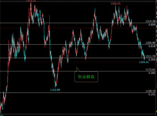对于目前的黄金行情,我认为没有什么所谓的技术分析,只有从交易心理的角度来操作。1200整数关口是黄金多头的心理防线,不破1200整数关口,那么多头仍然会继续挣扎,所以别跟我扯什么趋势空头,那都是忽悠新手的。我只能说,这个位置做多肯定要比某些人去追空的胜算更大些。 黄金从高点的1365美元,截止到上周盘的1204低点,在接近四个月时间内跌去了超过160美金之多,然而连跌中并未出现很好的反弹修正,因此从空间上来讲空头已无优势。但不能否认的是,空头倾向仍未结束,只是短期内再去盲目看空的风险较大,所以上周盘触低后,本周初价格能够企稳,金市或将迎来较好的一波反弹。所以个人先维持看反弹的观点不变。周线方