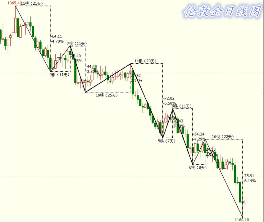 黄金报1276,上午10:00,几日未跟新,不代表没关注行情,昨日的行情在今年来说算是一个过山车般的刺激了,单日波动20多美金,在最近这段时间来说这个行情是比较少见的了。以下对于目前大周期的行情可以先来做个总结,下图一目了然。首先就日线自1365的下跌开始看待这波下跌,如图所示,我们可以把这波下跌分为几段来看,图中第一周期的下跌自1365至1300,跌幅65美金,这波下跌持续了21天,随即伴随的是小周期25美金左右的反弹。第二波比较大幅的下跌则是自1309至1236,跌幅达到了72美金左右,时间周期刚好也是20天,伴随而来的就是小周期28美金左右的反弹。再来就是这一次的大幅下跌了,1236-