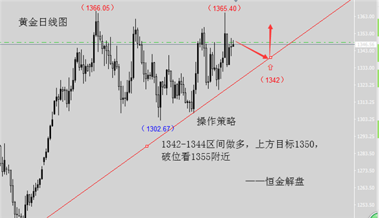 今日亚盘先回落到1342,欧盘1342企稳反弹上1350,而冲上1350,我认为并不代表多头强势,个人来说目前金价还是一个震荡行情,而且目前黄金的压力位在1357,同时上周的起跌点也在1357,根据顶底转换这里就成为成第一压力,因此高位可以博空,下跌到支撑位附近可以博多。冲高上1350,建议进场空,等待下跌。另外一个今日美指跟