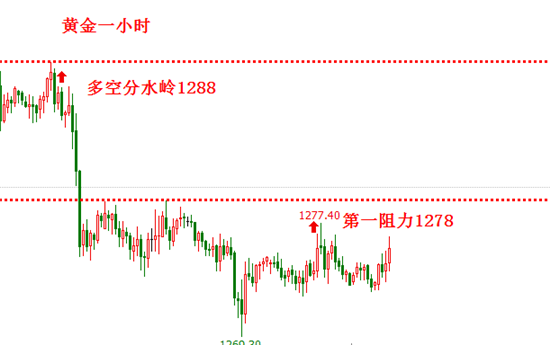 昨日行情最低1272反弹,最高反弹到1277回落,冲击1278阻力失败。目前和最近的行情跟大家分析的很清楚了,弱势震荡,第一阻力1278,多空分水岭1288,突破1288,确认多头反转。不破,继续弱势震荡筑底,横盘整理之后再看拉升,操作上以低多主,只要1266双底不破,保持低位看反弹的操作思路。 从本周的走势来看,从周一到周三,盘面都是弱震荡,上周四,周五连续暴跌之后,很明显现在行情下方存在支撑,下方1266底部支撑强劲,继续下跌的动能在减弱,但是上涨没有美指或者消息面的配合很难发动有效攻击,只能维持一个震荡整理,等待拉升契机。今日操作,依然关注1270上方的低多机会,关注第一阻力1278的