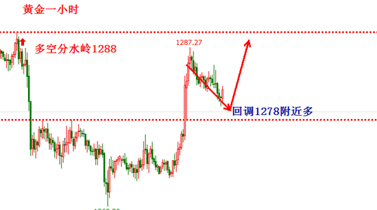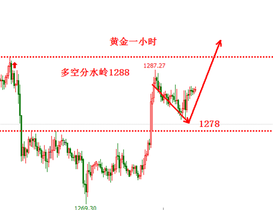 昨日行情,属于探底回升的走势,盘中最高触及1289,突破了前期阻力1288.在这周的分析中,恒金就指出在周初未能突破1288,会有一波向下调整,但是调整幅度不会很大。因为短期内,1266的底部存在强支撑,难以跌破。重点还是低多为主,看破1288分水岭的突破。 因此,在黄金回撤到1280下方1278-1275-1272一线,提示可以重点做多,金价最低在也在1274反弹,美盘大涨,多单大赚。不过昨日我也没有预料到黄金能一根大阳突破1288.我预判行情涨到1288会有承压,多单也是在1286出局。不过盘中的拉升力度很强,突破1288之后,今日则继续看涨,站上1290上方重点关注1300阻力!今日操