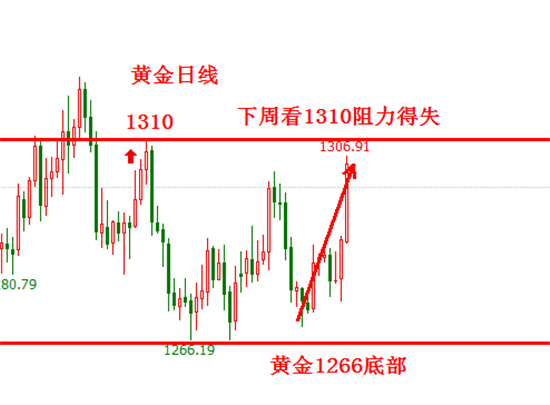 上周黄金,周一到周三弱势震荡,周四一根阳线拔地而起,带动了反弹,周五高位震荡。今年黄金的行情很多次都是这样演绎了,跌一波之后转震荡,箱体震荡整理之后出中阳或者大阳,反弹冲高一波之后又大跌回落,简单来说,就是跌多了就涨,涨多了就跌。在上周,恒金强调了两个阻力位,第一个1278,第二个1288。1278阻力只是代表短期内的高点压制,而1288可以看做是一个多空分水岭位置。周四黄金的上涨突破了1278,但是没有突破1288,可以看到多头反转还欠火候,没有能够一举破位,还需要一个震荡之后再走加速上涨突破。因此,下周黄金,首先是看1278-1288区间的箱体震荡,震荡之后再看上涨突破。 上周最低在12
