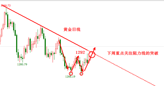 上周的行情,基本上是以震荡为主,大体上维持1278-1288之间的震荡横盘,期间在周三一波上涨到1291,最后也是冲高回落到1280下,昙花一现,突破后并没有展开延续性拉升。横盘了一周之后,目前行情也到了变盘的关键区域了。从日线来看(下图),目前行情运行区域逼近日线阻力趋势线附近,如果能突破日线阻力压制,冲上1300基本没有悬念,甚至年内可创新高。如果破位不了,那么震荡向下,还将有新低出现。因此,下周关键的走势就是看能不能冲破这个阻力线压制,打开上涨空间。 恒金对于后期走势,看多思路不变,对于冲破上方阻力线保持乐观。从日线形态来看,金价两次从1266探底回升,形成了W双底形态,而且上周也突破