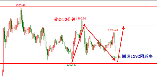 最近恒金跟大家强调了1292支撑上做多的思路。金价最低跌至1292,多单进场,昨日一波反弹最高到1300,多单斩获利润。本周自周一大涨形成突破之后,趋势变成上涨,而1292由压力变成支撑。周二最低回撤到1293反弹,周三最低回撤到1292也是反弹,足以说明,1292支撑的有效性。今日可继续回调到1292支撑上布局多单看涨。 本周黄金借助利好大涨之后,目前进入到了1292-1300的横盘整理,整理之后是继续上涨还是冲高回落,判断标准是:只要金价不跌破1288,如果跌破1288则上涨难以为继了。不破1288,则维持看多判断。做黄金就是先预判,再跟随,加上盘中应变。我预判黄金周一突破日线阻力压制之