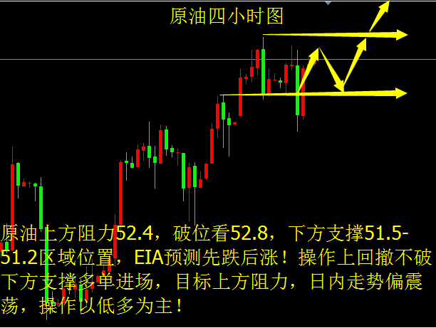皓坤论金:10.18原油晚间能否站稳52关口?晚间EIA如何操作! 导读:原油基本面分析,EIA走势预测,原油还会不会涨?原油技术分析,日内走势支撑阻力在哪儿?EIA操作思路! 原油基本面分析,EIA走势预测,原油还会不会涨? 原油方面,油价周二一直维持区间震荡,今日API对原油的影响也不大,因对美国产量和出口增加的预期,抵