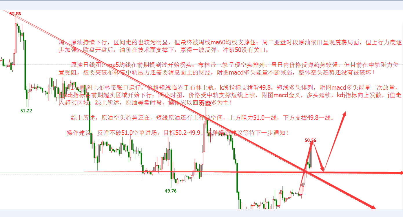 文\皓坤论金 皓坤论金:10.11原油反弹不破51果断空,API走势预测原油多空单被套解套 基本面分析,后市还会涨吗? 原油从大趋势上分析,原油自上方52.83一路下滑,主要是受到美国方面页岩油生产商的产量压制,因为页岩油生产成本高要在50美元上方才有利润可言。目前虽然油价已经跌破了50美元关口,但是页岩油前面暴增的库存还