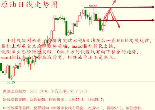原油行情解析,暴跌之后为何反转多头!下周原油怎么看? 原油周线两连阴,自受阻59回落,高点在下移,低点在抬低。周一原油高开低走,受阻58.36回落,日线收小阴线,周二原油整体波动不大,处于57-58区间震荡,日线收十字星,周三亚欧盘震荡受阻57.6回落,晚间EIA数据利多短线冲高受阻57回落走低。 日线收大阴线,周四亚盘震