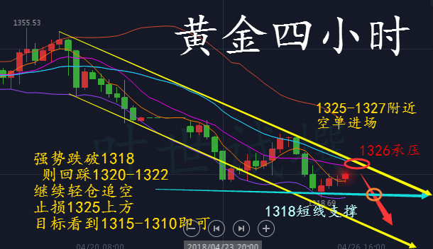 五一来临,在这里祝大家假期愉快,生活还要继续,多陪陪家人,你会发现没有什么比家人更重要,今日黄金如何操作行情走势策略分析及解套?黄金依托周五1326压制位,1325附近看空,短线看1319的支撑,破位看1315,不破看反弹。原油震荡下行的走势依托68看空,看67的支撑。 黄金 上周五,黄金有所走高,终结前两个交易日的下跌