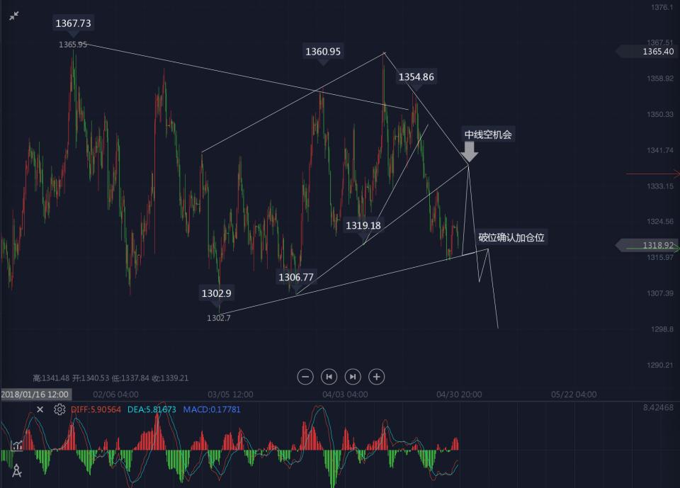 五一即将来临,各位投资朋友可以在这个假期好好的休息一下,毕竟生活还有继续,提前祝大家假期愉快,老师假期继续指导,有问题及套单的可找叶世诚老师聊聊。 黄金 说一说本周的黄金吧,消息面避险情绪的消退,及美元一系列的利好消息导致美元,本周一路上涨,而黄金周一开盘1335后开始在消息面的刺激下,震荡下行,下方不断