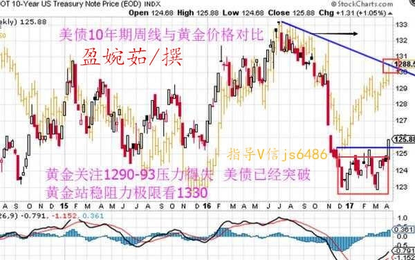 盈婉茹:4月17黄金借助没在突破区间,下周高开直冲前千三一线 近期来市场避险情绪过于高涨,美元指数表现不是很强,主要还是由于全球政局不稳定导致。 从前段时间的美国空袭叙利亚事件开始,到欧洲法国大选,在到朝鲜核问题,特别是特朗普对于朝鲜的态度可能会表现的非常强硬。 这导致了市场避险情绪的飙涨,从下图的美债价